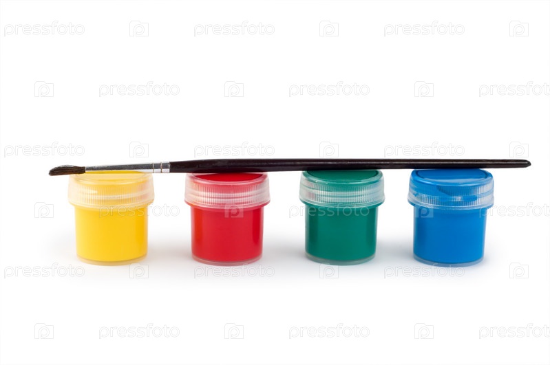 Желтая, красная, зеленая и голубая гуашь и кисть на белом фоне