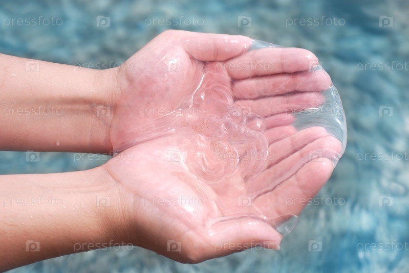 Медуза в женских руках на фоне синего моря