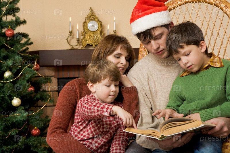 Маленькие братья указывают на страницу книги, в то время как их отец читает им