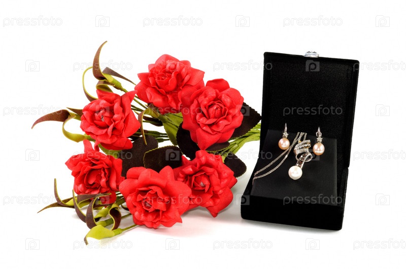 Коробочка с серьгами и букет цветов на белом фоне