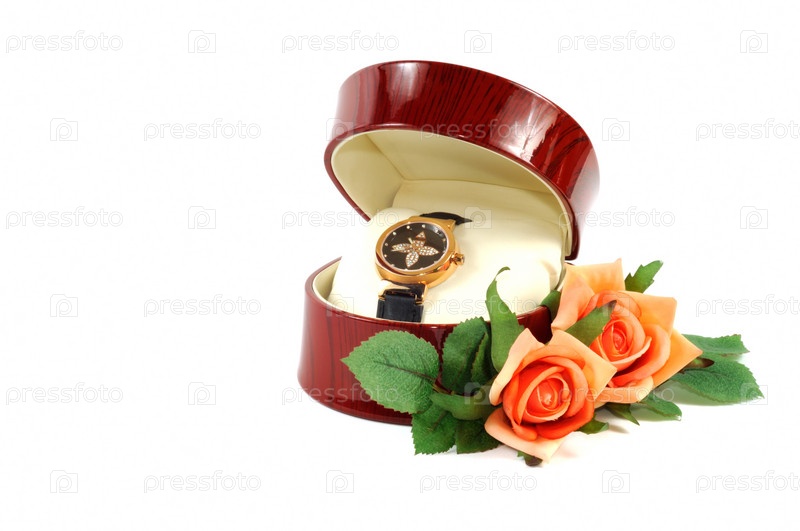 Коробочка с часами и букет цветов на белом фоне