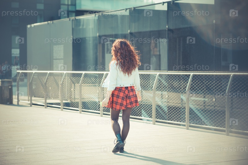 Молодая женщина с рыжими вьющимися волосами на улице в городе