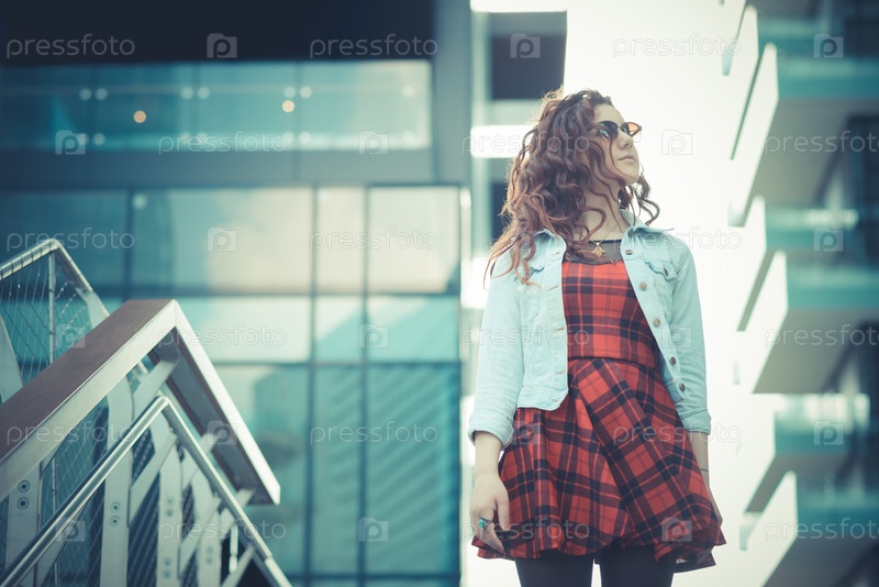 Молодая женщина с рыжими вьющимися волосами на улице в городе