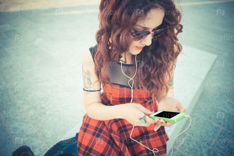 Молодая женщина с рыжими вьющимися волосами в городе