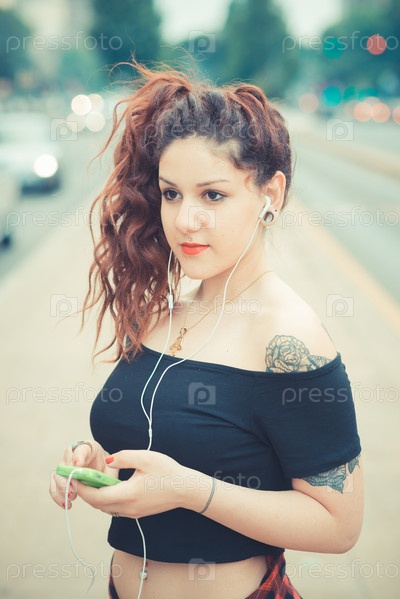 Молодая женщина с рыжими вьющимися волосами в городе