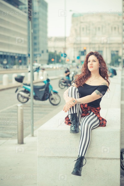 Молодая женщина с рыжими вьющимися волосами в городе