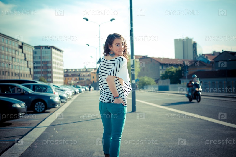 Молодая красивая брюнетка на улице в городе
