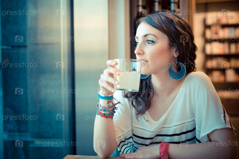 Молодая красивая брюнетка в кафе