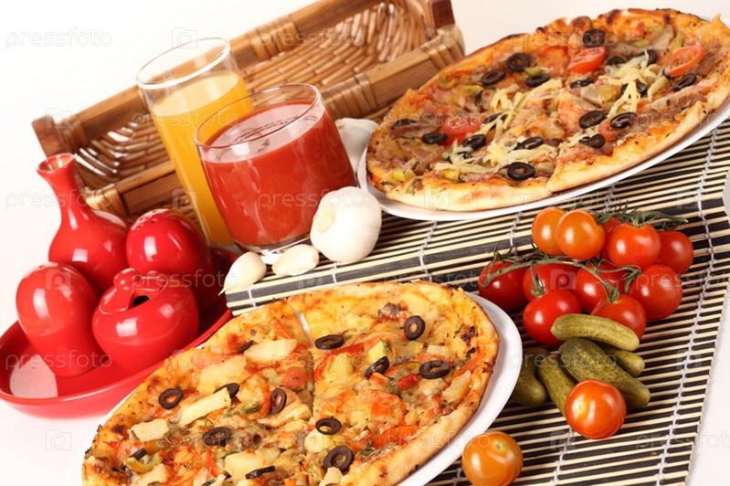 Пицца, соки и свежие помидорчики на столе