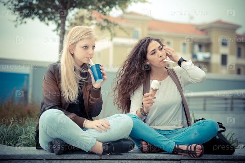 Две красивые стильные девушки в городе