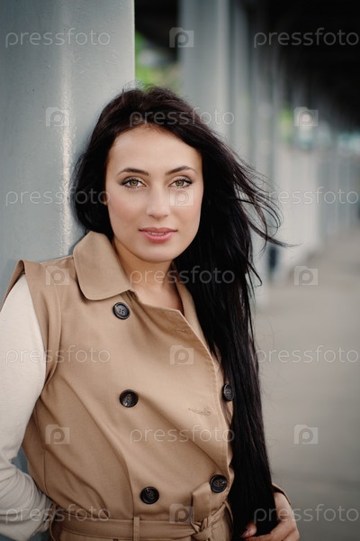 Молодая красивая брюнетка стоит на станции