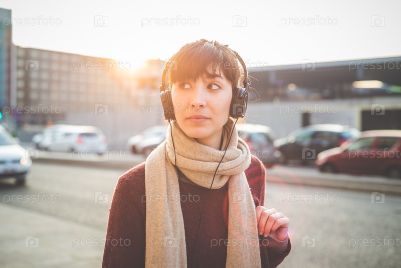 Молодая красивая женщина в наушниках на улице