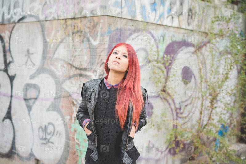 Стильная девушка с красными волосами на улице