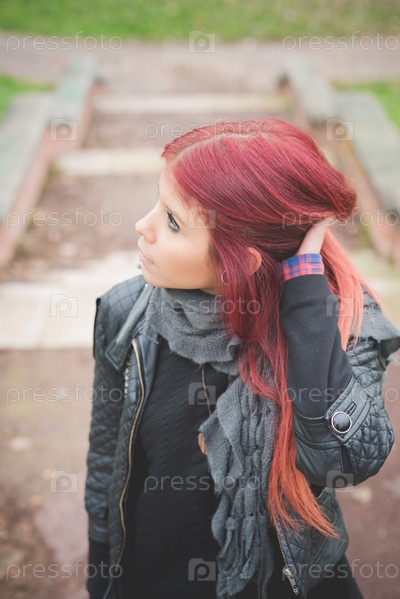 Стильная девушка с красными волосами на улице