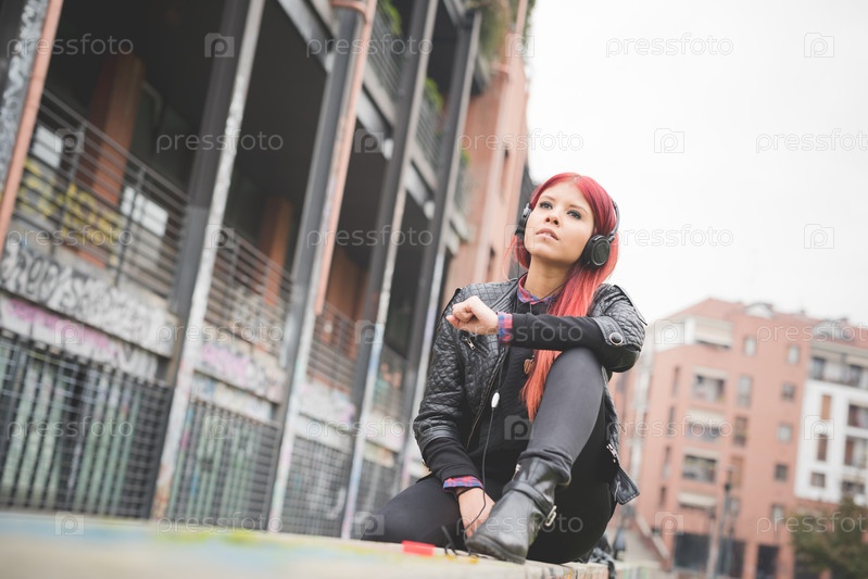 Стильная девушка с красными волосами на улице