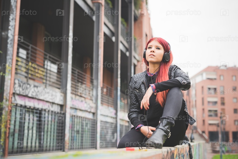 Стильная девушка с красными волосами на улице