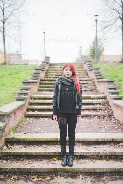 Стильная девушка с красными волосами на улице