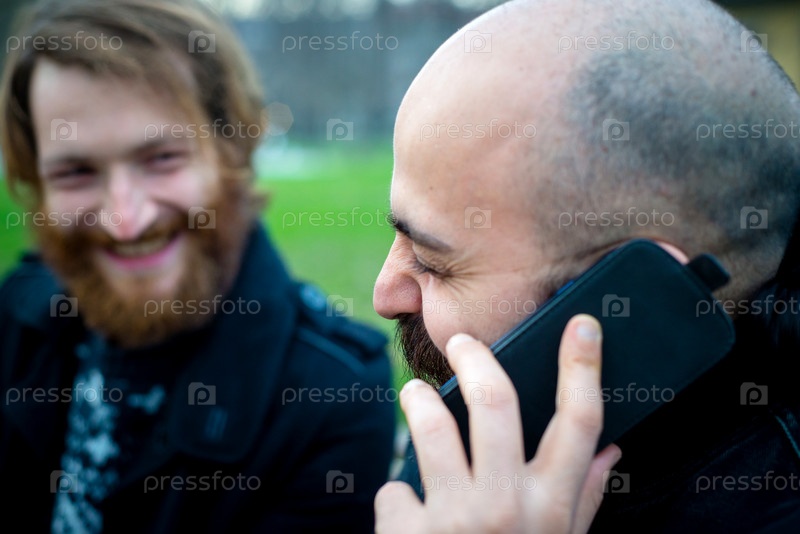 Бородатые современные молодые мужчины в парке