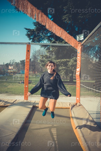 Молодая красивая блондинка прыгает на батуте