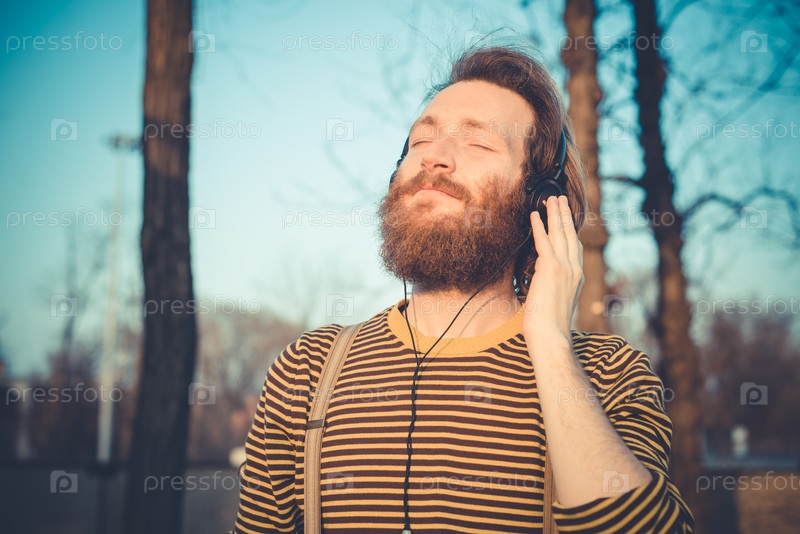Молодой бородатый мужчина слушает музыку