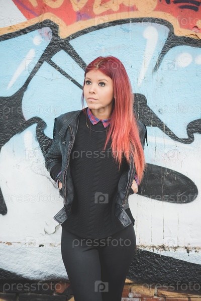 Стильная девушка с красными волосами на улице