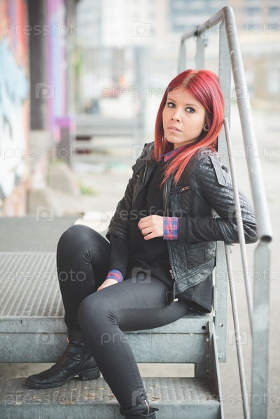 Стильная девушка с красными волосами на улице
