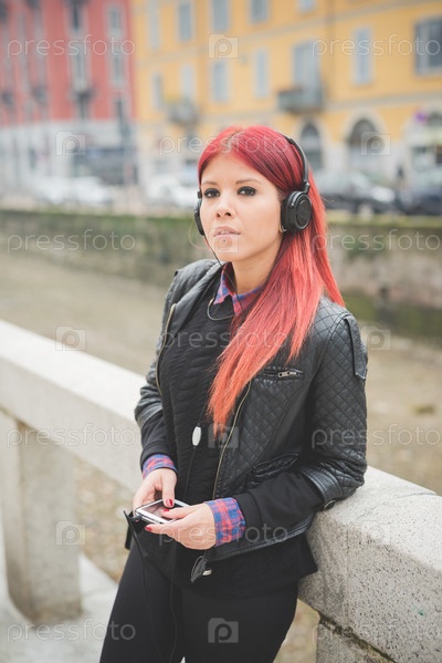 Стильная девушка с красными волосами на улице