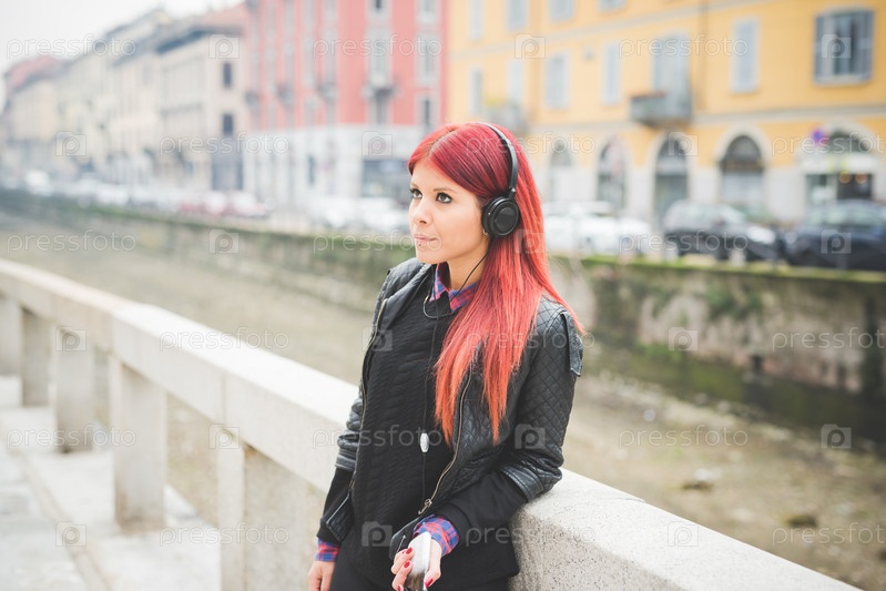 Стильная девушка с красными волосами на улице