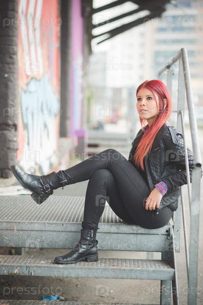 Стильная девушка с красными волосами на улице