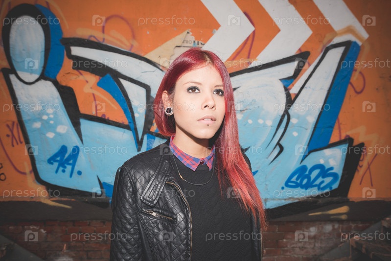 Стильная девушка с красными волосами на улице