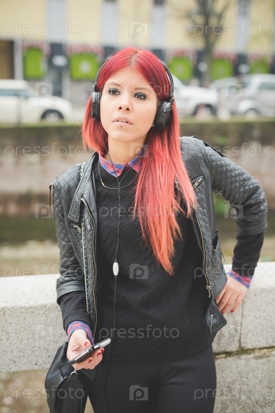 Стильная девушка с красными волосами на улице