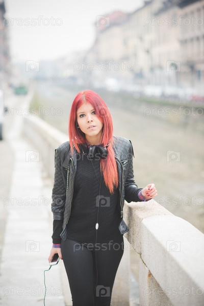 Стильная девушка с красными волосами на улице