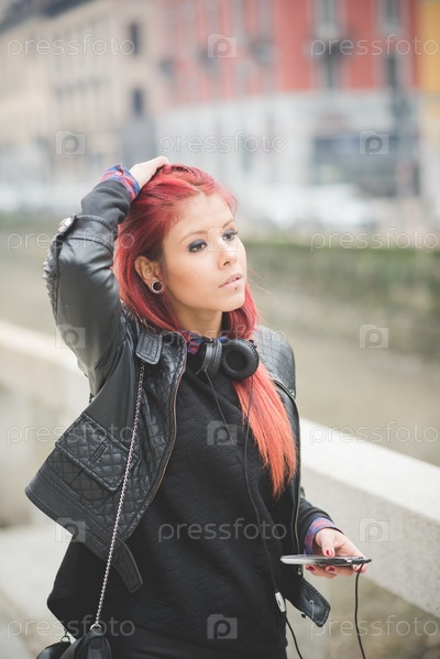 Стильная девушка с красными волосами на улице