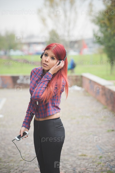 Стильная девушка с красными волосами на улице