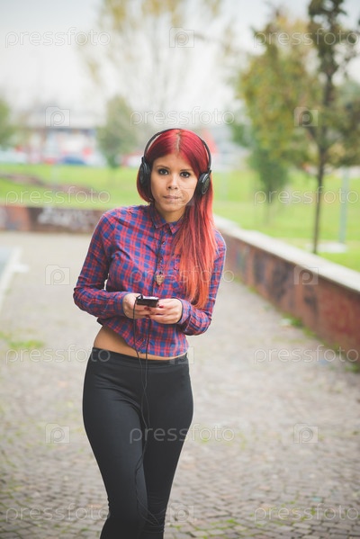 Стильная девушка с красными волосами на улице
