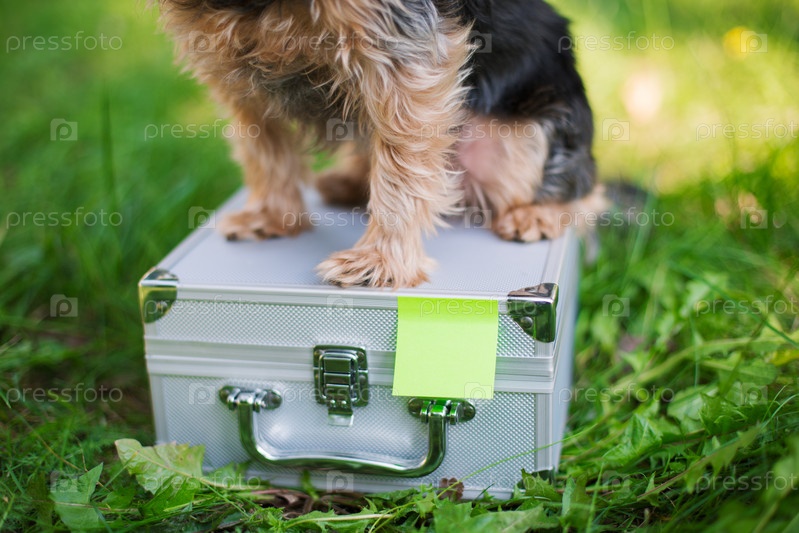 Йоркширский терьер сидит на чемодане