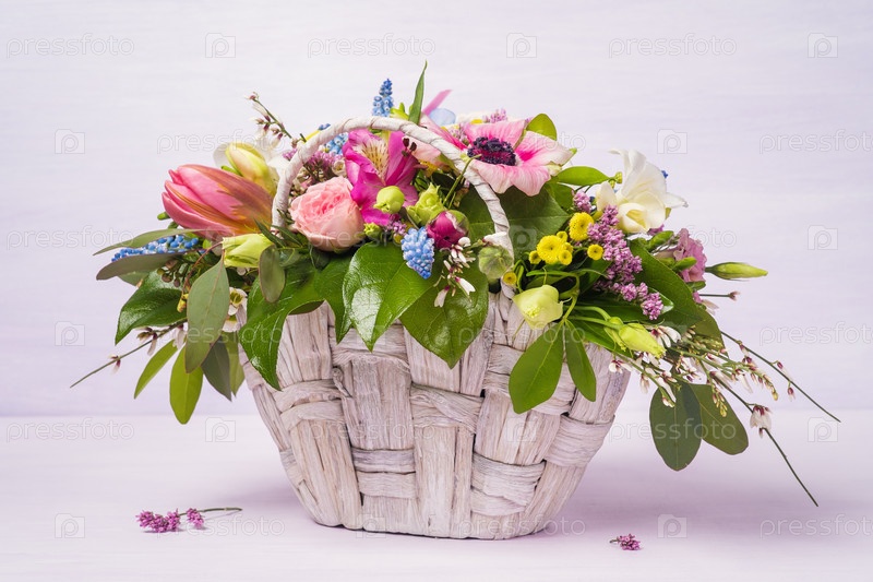 Красивый букет из весенних цветов в плетеной корзине