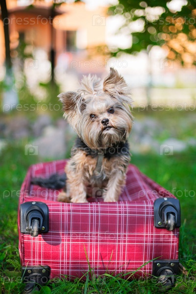 Йоркширский терьер сидит на чемодане