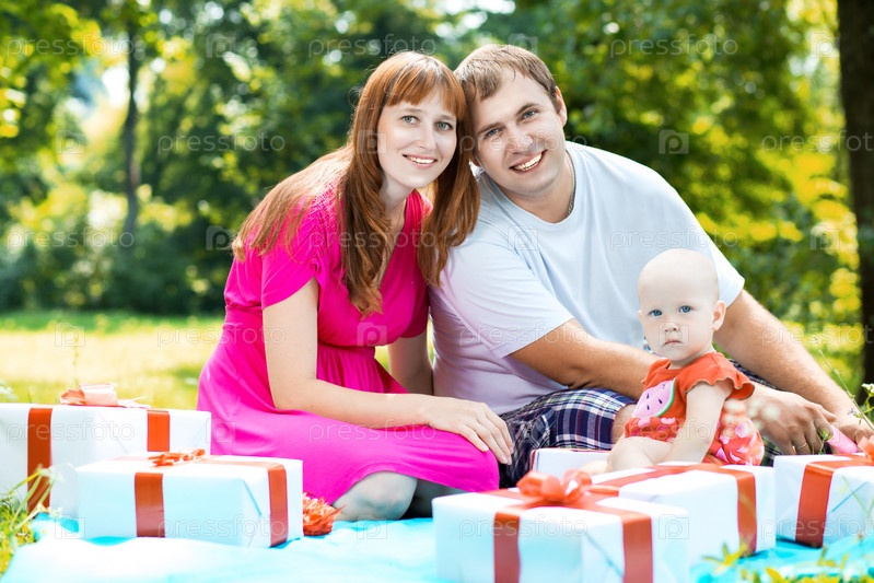 Радостная семья с подарочными коробками