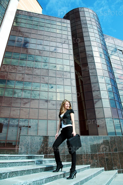 Девушка с портфелем на фоне офисного здания