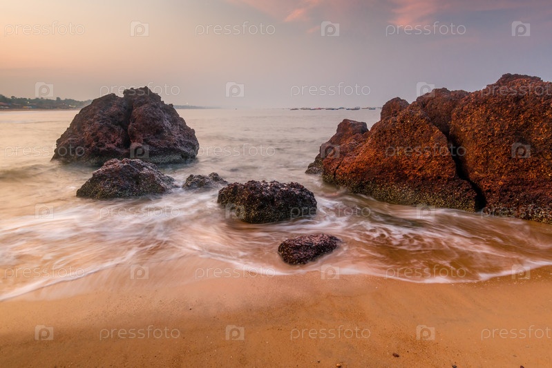 Большие валуны и песчаный пляж утром