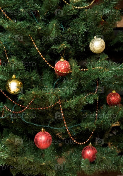 Близкий план ветви сосны с декоративными шарами и гирляндами на ней