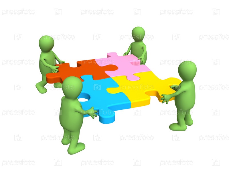 Четыре маленьких человека, держащие в руках разноцветные кусочки головоломки