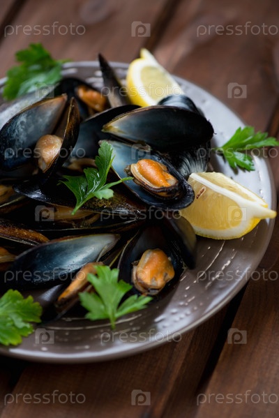 Вареные мидии с петрушкой и лимоном