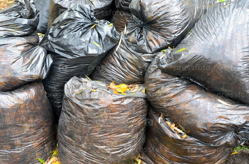 Пластиковые мешки с опавшими листьями