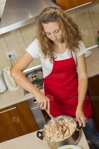 Женщина мешает салат