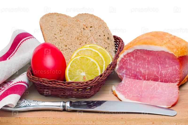 Ветчина, хлеб и овощи на белом фоне