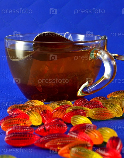 Разноцветный мармелад и чашка черного чая