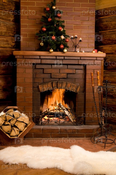 Фото камина с дровами и теплым белым мехом рядом