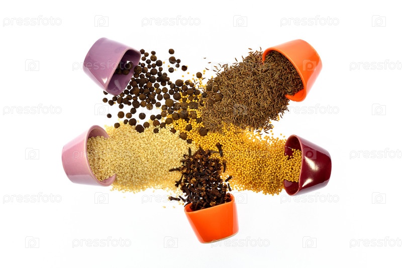 Семена, специи, зерна в небольших разноцветных чашках